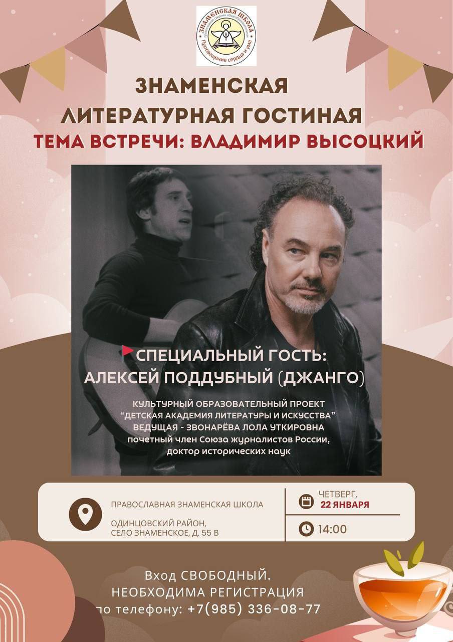 22 января в Знаменском храме села Знаменское в Одинцовском округе состоится встреча, приуроченная ко дню рождения Владимира Высоцкого. Мероприятие организовано в рамках культурно‑образовательного проекта «Детская академия литературы и искусства» при Знаменской православной школе.