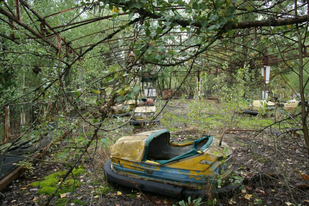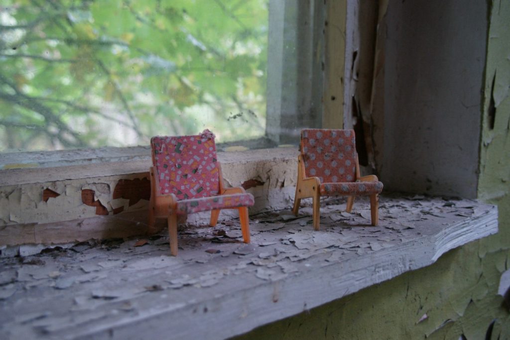 Чтобы въехать в 30-километровую зону, мы проходим через контрольно-пропускной пункт «Дитятки». Обязательный пункт осмотра – села Залесье и Копачи. Многие села были засыпаны целиком – от них остались только холмики, поросшие деревьями, но тут можно зайти в брошенный детский сад – на месте игрушки, кроватки, детские книжки. Только все разбросано и присыпано пылью тридцати лет. Кстати, говорят, что зона долго сохранялась нетронутой – мародёры появились не сразу, и годами дома стояли так, как будто их жители уехали только вчера.