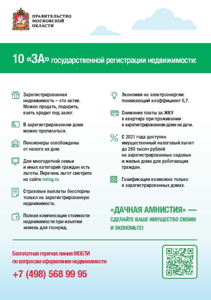 Узнать подробности проведения «дачной амнистии» и порядке регистрации прав можно по телефону Московского областного БТИ +7 498 568-88-88 или на портале Минмособлимущества.