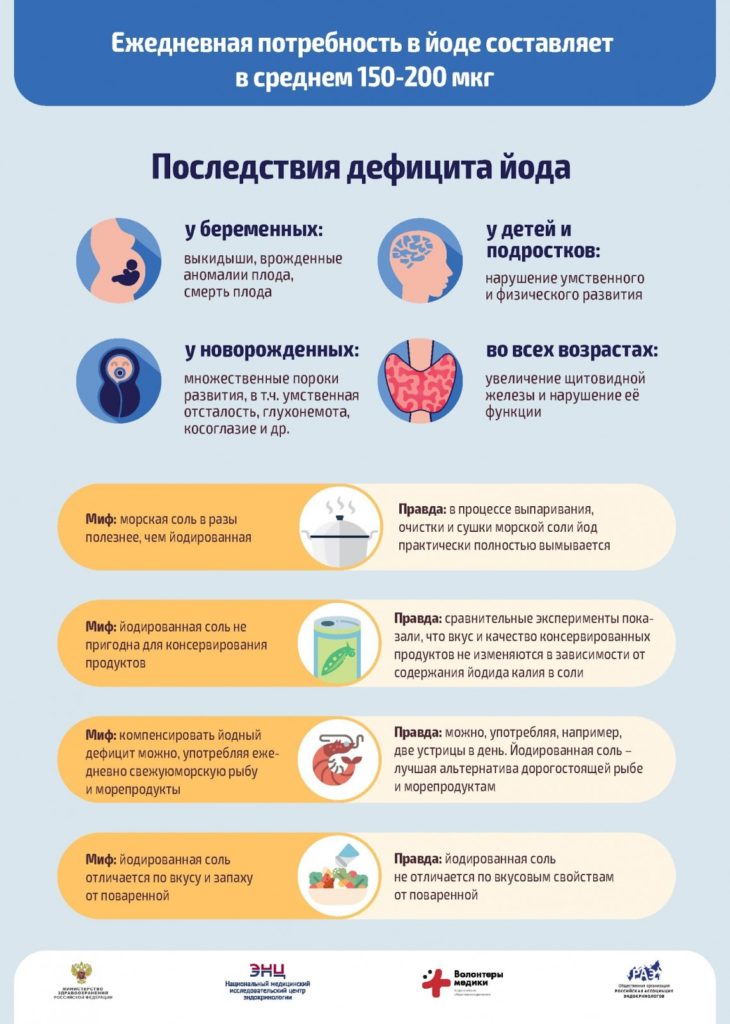 Всемирная организация здравоохранения рекомендует потреблять от 120 до 150 мкг йода в сутки ежедневно. По данным эндокринологического центра РАМН россиянин потребляет в день 40-80 мкг йода, что в 2-3 раза меньше его суточной потребности!