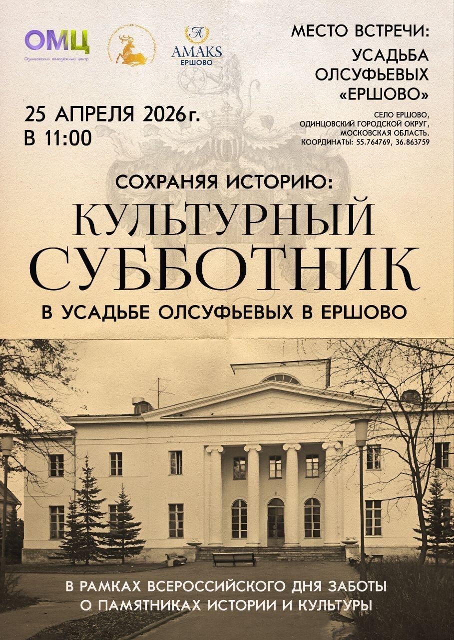 25 апреля 2026 года в селе Ершово Одинцовского округа состоится культурный субботник в усадьбе Олсуфьевых «Ершово» — объекте культурного наследия федерального значения. Начало мероприятия запланировано на 11:00, территория усадьбы будет открыта для свободного посещения.