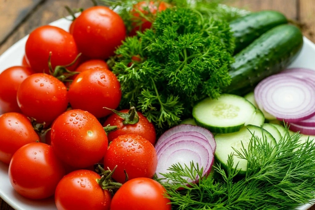 Например, с салатом «Ачик-чучук»: фиолетовый лук нарезать тончайшими полукольцами, промыть в ледяной воде, прямо в него тонкими дольками добавить помидоры, острый перчик чили и базилик. Перемешать и посолить перед самой подачей. Заправки этот салат не требует, но если нет аллергии, можно добавить немного мёда.