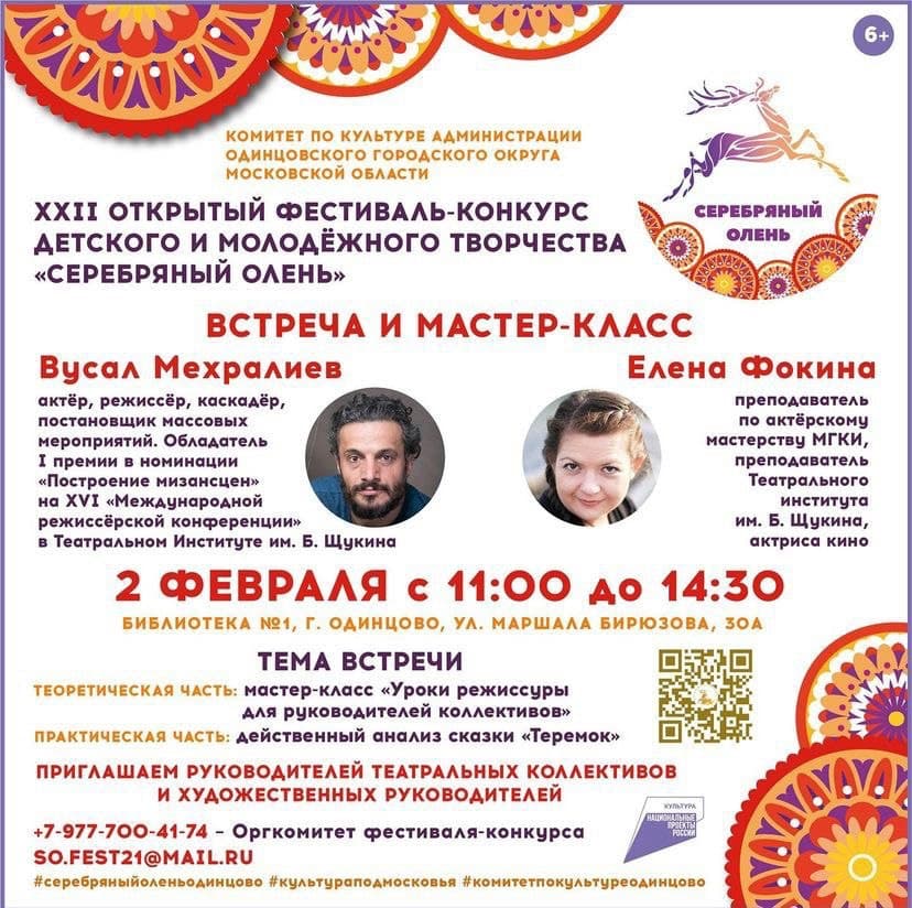 Участники окружного фестиваля «Серебряный олень» получили дополнительный подарок от организаторов. В Одинцовской библиотеке №1 2 февраля с 11:00 до 14:30 состоится встреча с известными артистами. Мастер-класс для желающих проведёт Елена Фокина — член жюри в номинациях «Театральное искусство» и «Художественное чтение», актриса кино, преподаватель по актёрскому мастерству МГКИ и ТИ им. Бориса Щукина.
