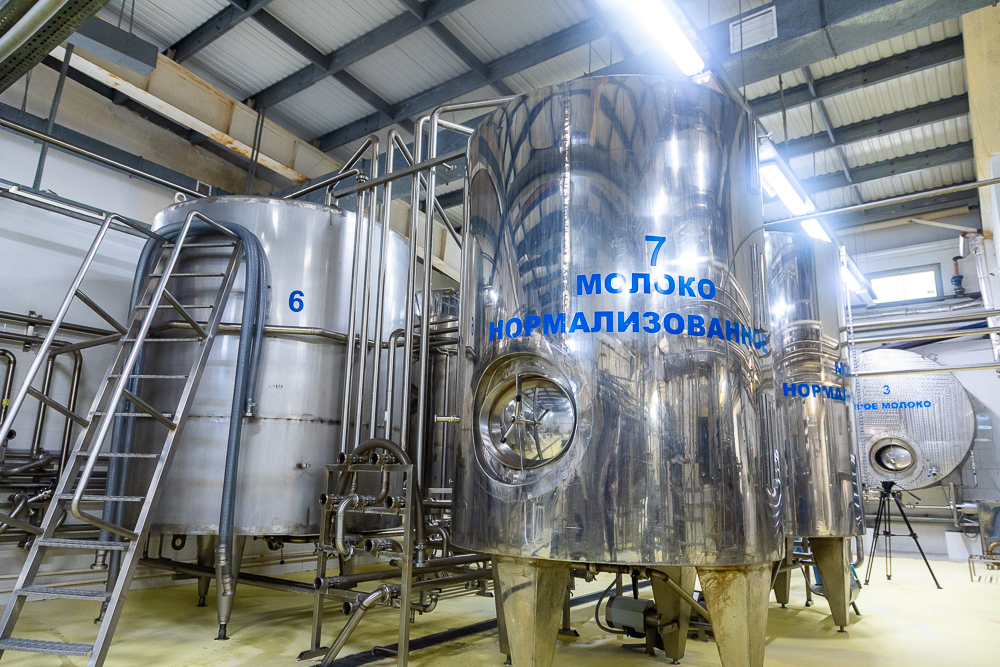 Молоко сюда привозят охлаждённым в специальной цистерне. Приём сырья происходит бесконтактным способом. Сырое молоко перекачивается в танки – термоизолированные нержавстальные ёмкости с холодильным агрегатом. Содержится в них не более суток, при низкой температуре. После очистки перегоняется по отдельным танкам в зависимости от дальнейшего вида обработки. Отборное молоко – в одну ёмкость, с жирностью 3,2 – в другую. Центральные танки используются под кефиры и йогурты.