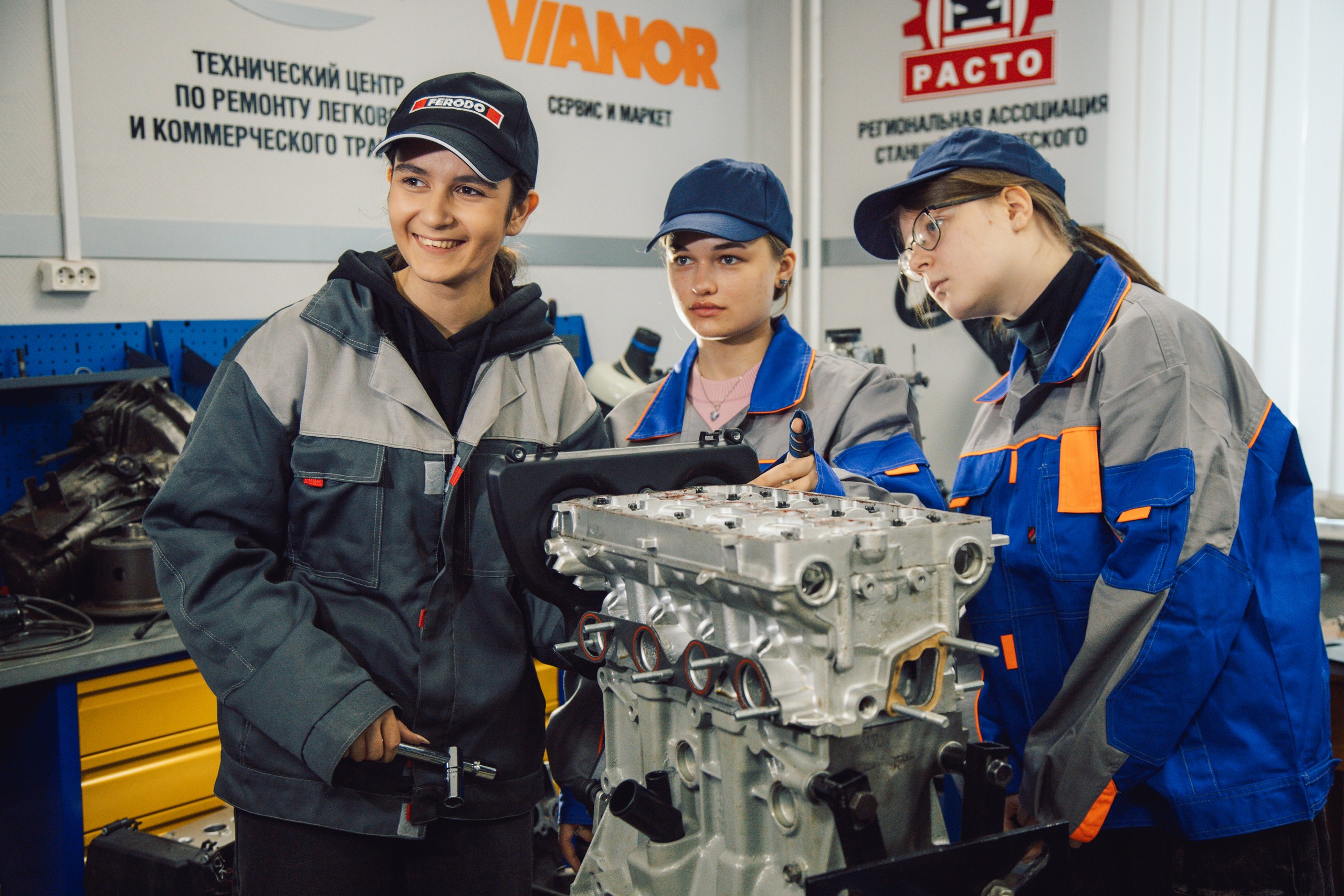 Будущих мастеров по ремонту автомобилей Олю Рыжкову, Яну Чекулаеву, Злату Салтыкову и Дарью Кирьянову мы застали в мастерской техникума за разборкой вазовского двигателя — такое задание они получили от преподавателя.