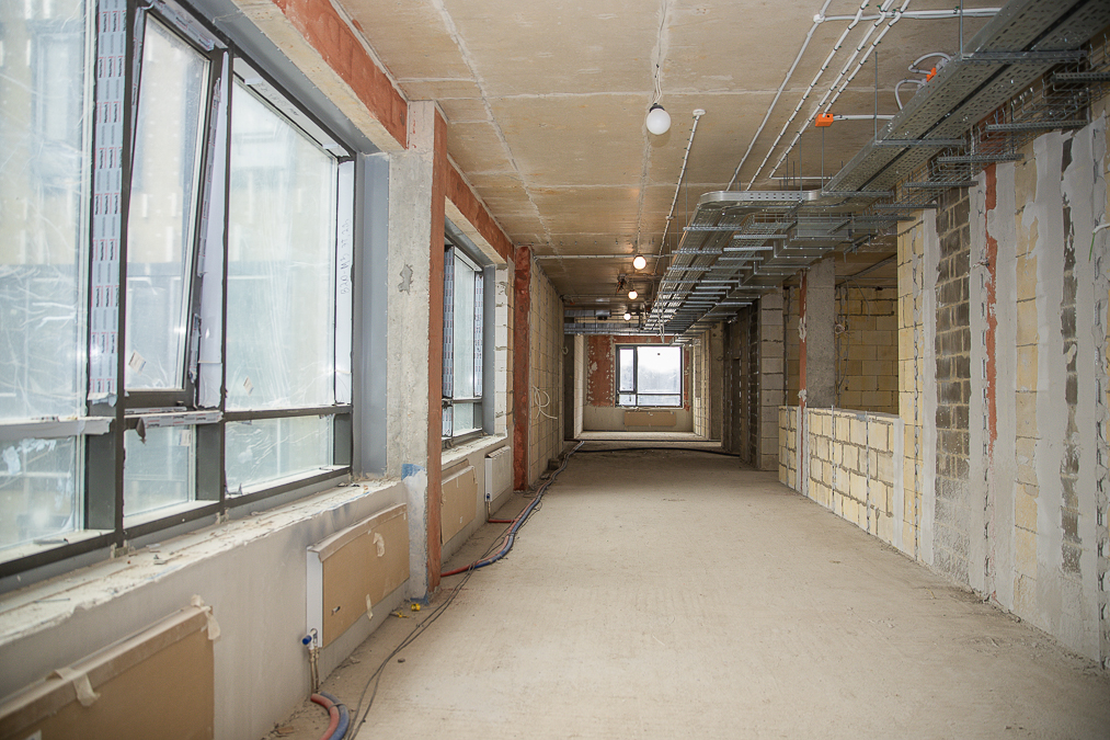 В настоящий момент строители установили окна, внутренние перегородки, смонтировали кровлю и внешние инженерные коммуникации, закончили отделку подвала. Завершается монтаж фасадов, системы вентиляции и кондиционирования, слаботочных сетей. Продолжается внутренняя отделка учебных классов и благоустройство территории.